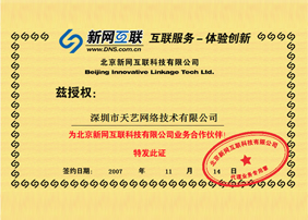 北京新网互联科技有限公司兹授权天艺网络为公司业务合作伙伴,并代理新网互联相关核心业务。