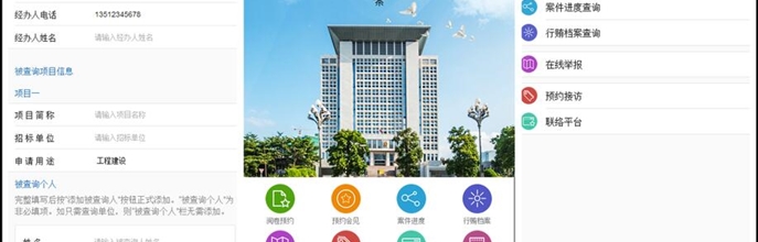 移动电子检务APP系统及微网站,通过移动终端实施阅卷预约、律师预约会见、案件进度查询、行贿档案查询、在线举报、预约接访、联络平台及南检动态8类功能。