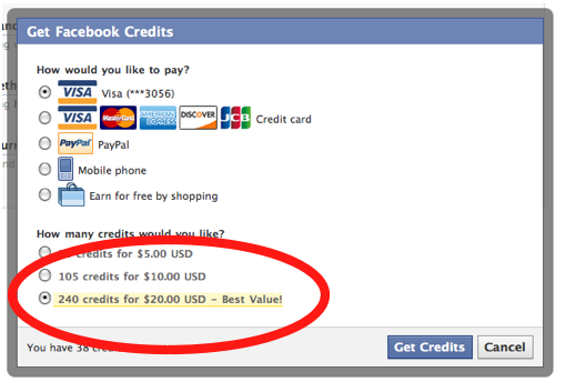 Facebook 2009年开始测试信用币,部分目的是实现收入来源的多样化。该系统允许用户使用单一的虚拟币在不同游戏中购买道具,Facebook则会从中抽取分成。Facebook今年强制要求所有基于其平台开发的应用都必须使用信用币出售虚拟商品。