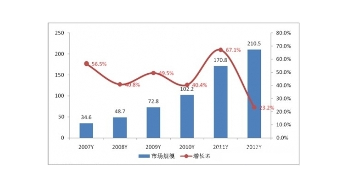 图2 2007-2012年中国IDC市场基础业务规模及增长