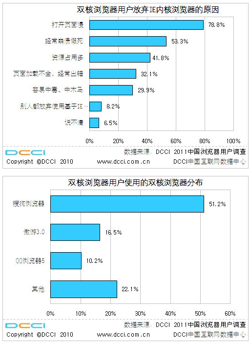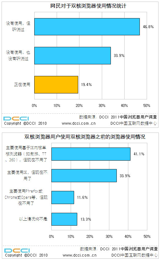 3月11日,据DCCI互联网数据中心《2011中国浏览器用户调查》结果显示,约19.4%的中国网民在对浏览器种类选择的调查中,选择使用双核浏览器。自2010年初以来,搜狗、腾讯、遨游3.0等浏览器厂商相继推出基于IETrident内核以及WebKit内核的双核浏览器,一年时间,双核浏览器的市场占有率迅速增长,成为浏览器市场主流。