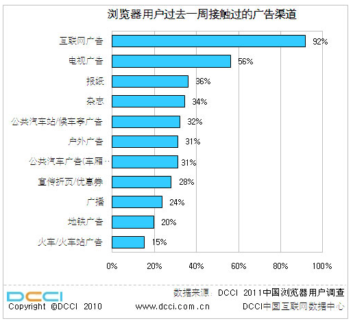 DCCI数据同时显示,浏览器用户过去一周最主要接触的广告媒介是互联网广告,占比92%,电视广告以以56%的比例排第二,排名第三的报纸为36%。