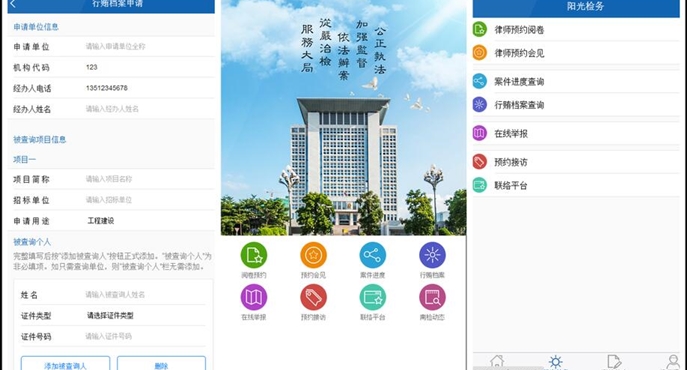 移动电子检务APP系统及微网站,通过移动终端实施阅卷预约、律师预约会见、案件进度查询、行贿档案查询、在线举报、预约接访、联络平台及南检动态8类功能。
