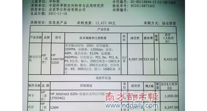 南都讯昨日,华声论坛出现了一条关于政府采购的帖子,引起广大网友关注。帖子中的合同文件显示,中科院空间科学与应用研究所购买的打印机内存条,价格竟高达6274元。昨日,中科院空间科学与应用研究所向记者证实有此单采购,并称是通过正规渠道合法采购的。而惠普(中国)公司指定经销商在接受记者采访时表示,同型号的一般内存条只要300元左右,而原装同型号的内存条也只售600元左右。